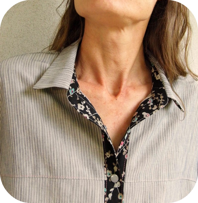 La patte de boutonnage, le dessous de col et l'intérieur du pied de col sont en voile doublé de coton, ce ne fût pas une mince affaire mais je suis ravie autant du rendu que de l'aventure couturesque qui m'y a mené !!